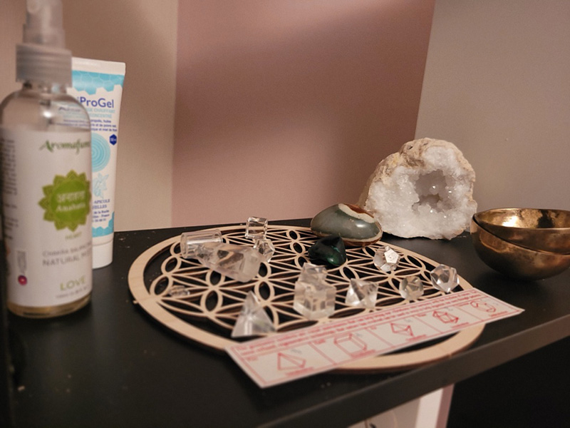 Ce soin unique associe l’énergie des cristaux, la chromothérapie et la géométrie sacrée avec une ambiance musicale. Cristalline des pierres et des cristaux à des techniques énergétiques avancées par le son. En utilisant les propriétés spécifiques des cristaux et une ambiance musicale, Nathalie rééquilibre les chakras, purifie l’aura, et crée une sensation de légèreté et d’harmonie intérieure. C’est une expérience profonde de connexion avec soi-même et l’univers.